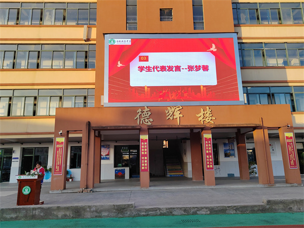 九(6)班学生张梦馨同学代表全体学生发言,感谢了各位校领导、老师、同学们对她的支持和鼓励;从学生角度讲述了几点自己认为比较重要的做法:注重课堂、时间和态度,同时还要树立远大志向。