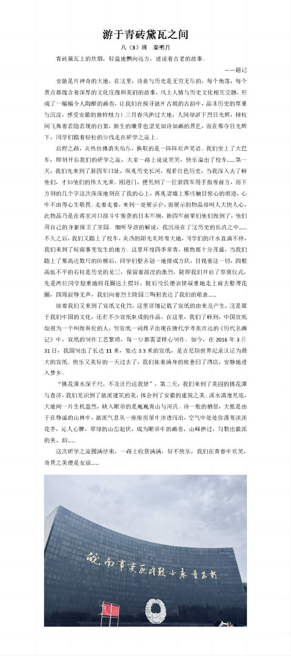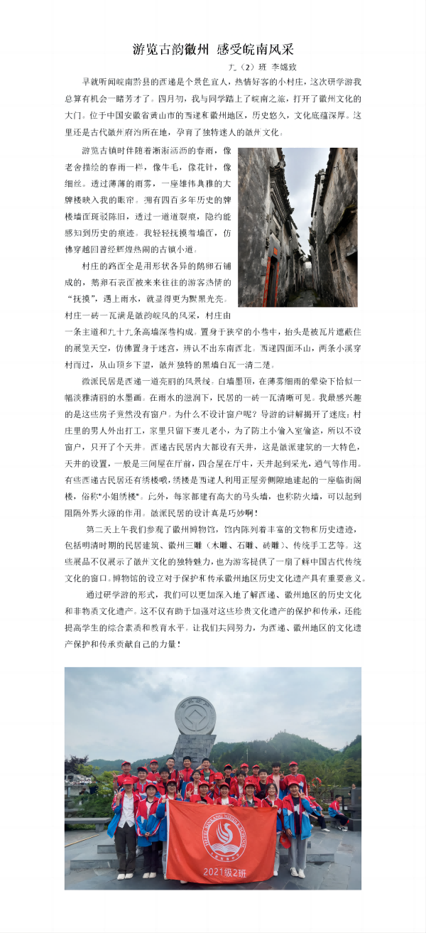 2024年4月25日和26日,我校组织的研学游活动取得了圆满成功。七八年级去往宣城的泾县,九年级去往黄山的徽州,在这次研学游中,学生们深入体验,收获颇丰。