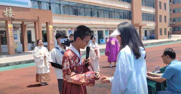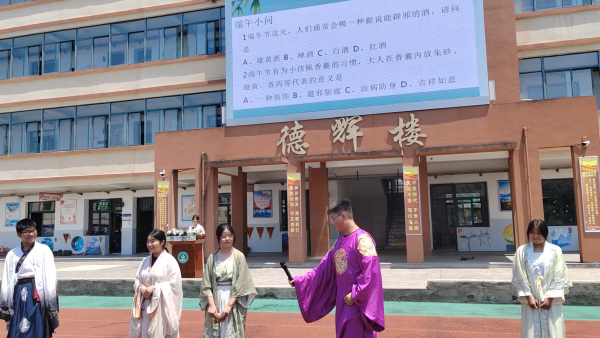为活跃现场气氛,活动中还加入了端午文化知识有奖竞答环节,同学们踊跃参与,收获了惊喜礼品。恰逢中高考临近,相传考前出门顶一顶粽子有高中的美好寓意,学校就为初高中毕业班每个班级准备了粽子,为他们送去了最美好的祝福。