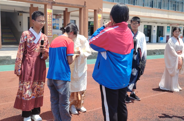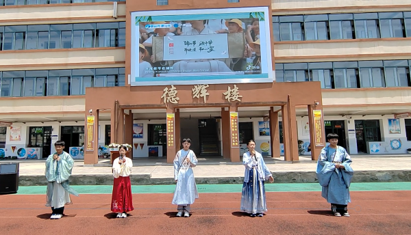 为了让同学们更深刻地感受端午的文化内涵,八(6)班的吴嘉滢、梁弘、端木瑞泽、尹轩熙、魏家星带来歌曲《南北谣》。几位同学身着古装唱出了中华文化的悠久的历史、浓郁的民俗氛围、惊艳的龙舟比赛、美味的传统美食·····同学们沉浸于中华优秀传统文化中,心中的文化自信不知不觉已被点燃。