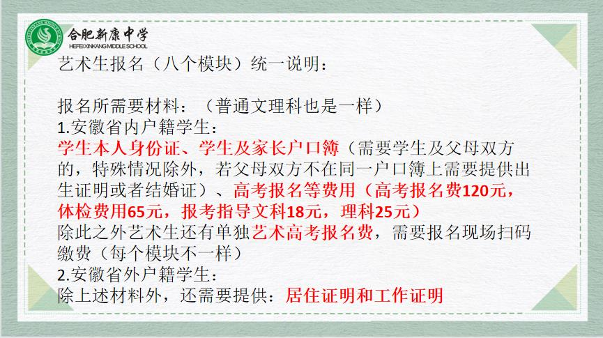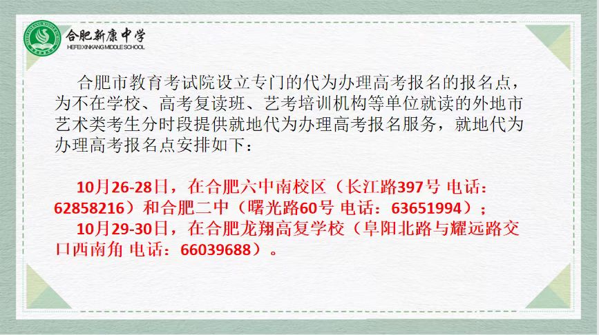 一是封闭管理或因疫情影响暂时无法到达学校的艺术类考生,暂定10月28号到合肥新康中学阅览室报名。二是届时如果考生因为封闭管理而无法离开小区,考生或家长应向班主任和社区报告,申请参加高考报名,教育部门将对接有关部门,通过闭环管理,在确保安全的前提下为这些考生做好报名服务。三是我校结合疫情防控要求,艺术类考生返校报名时,请严格按照学校通知的时段分批次进行,保持二米线,做到不聚集;我校在学校阅览室设置报名场所,与校内人员不交叉;要查验报名人的身份,只允许学生进入报名点,做到严把校门关。