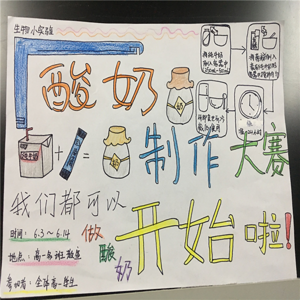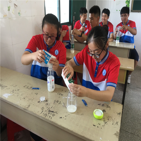 为了提高学生对生物学习的兴趣,丰富学生的课余生活,提高学生学以致用的能力,学校生物组精心筹备并举行了高一年级全体学生酸奶制作活动。