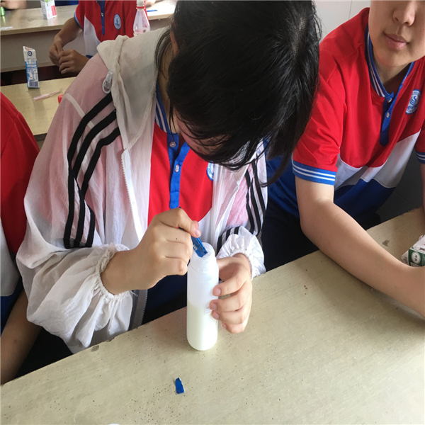 活动安排在大课间举行,学生们把准备好的纯牛奶倒入瓶中,加入适量的乳酸菌,搅拌均匀,然后经过24小时的发酵就成了酸奶。学生们看到液态的纯牛奶经过乳酸菌一昼夜的发酵成了粘稠的酸奶,十分惊喜。最让人高兴的是品尝环节。同学们拿着自己制作的酸奶,看着和果冻一样的质地,才知道小小的乳酸菌如此神奇,一天的时间就让牛奶变成了也如此粘稠的酸奶。闻一闻,有浓浓的酸奶味;尝一口,味道酸酸的。还有的学生不敢喝自己制作的酸奶,看到别人都喝,也勇敢地尝试着喝一口。品尝了正宗的酸奶的味道,学生们才知道原来超市中的酸奶是加了增稠剂和大量的糖。为了养成健康的生活方式,同学们表示以后还是自己制作酸奶比较放心。