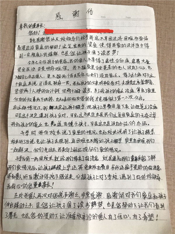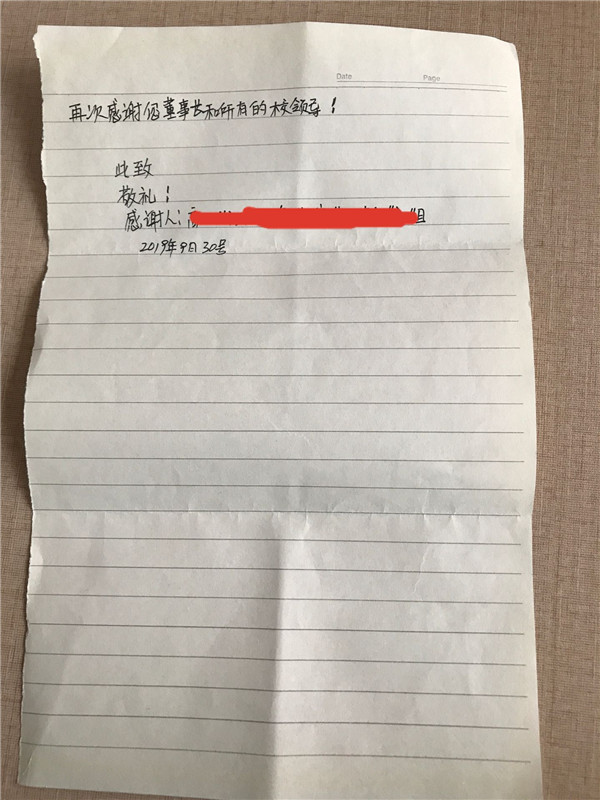 近日,汪语母亲封女士写给董事长王俊的感谢信中说到,“感谢您和校领导给予我这个不幸因经济困难而面临崩溃边沿家庭的帮助!非常感谢您对我们家庭和孩子伸出援助之手,是您让孩子圆了读书梦,也是您的资助,让准备放弃治疗的爱人有了信心,有了希望……”