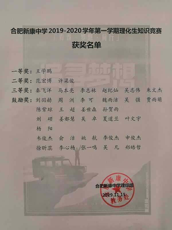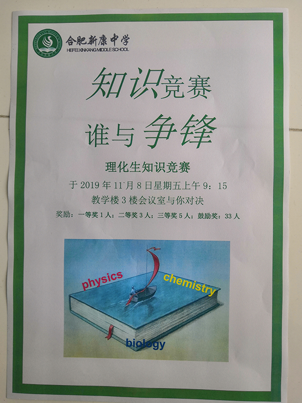 为促进学生理化生知识的应用以及掌握能力,合肥新康中学高中部于2019年11月8日上午在教学楼3楼会议室举行了理化生知识竞赛。