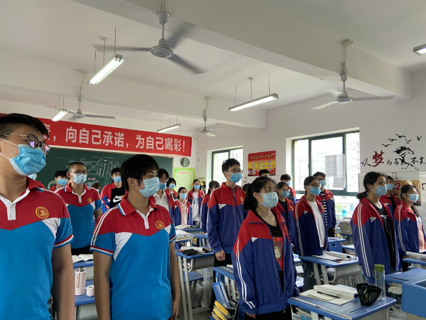 上午9:35,主持人高一(3)班徐新瑞同学宣布升旗仪式正式开始。全体师生面对屏幕,进行庄严的升旗仪式并齐唱国歌。