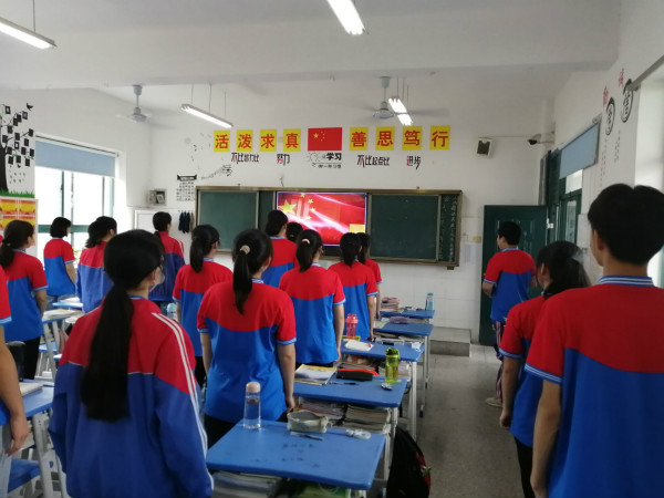 上午9:35,主持人高一(3)班赵梦婷同学宣布升旗仪式正式开始,全体师生面对屏幕行注目礼,并齐唱国歌。
