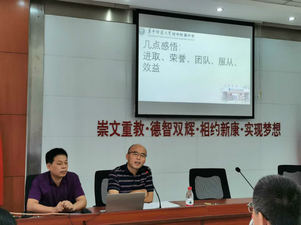 余老师通过学校班级的纪律管理、手机管理、寝室管理、尖子班的教师构成、领导管理、尖子班的教学、备课、教研等实际管理分析,在教师班级管理及教学的成长上做了高位引领,还与教师们分享了自己的感悟:进取、荣誉、团队、服从、效益!