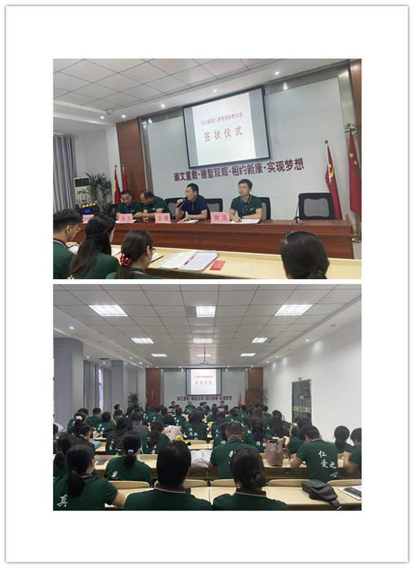 会上,为了明确2022届高三高考奋斗目标,创造新康高考新辉煌,为学校发展关键时期助力提升,段校长从目标任务、考核思路、责任明确等方面详细解读了2022届高三高考目标责任状,对高三全体教师提出具体要求。随后,董事长兼校长王俊先生与高三年级主任樊浩主任签订了责任状。