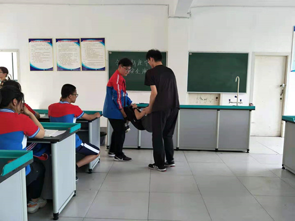 化学药品中本就有部分危险药品,实验过程中也会出现各种突发事故,徐老师教导学生面对突发事故如何应急处理:如加热试管出现烫伤、酒精灯不小心洒落酒精引起着火、器皿摔碎、药剂不慎溅入眼中、学生因实验室有异常气体突然晕倒以及实验室毒气泄漏应如何处理。在危险处理环节中,让学生切身体验,从同学的实验操作中,徐老师分析了不规范操作产生的不利影响,进一步增强了学生的防范与安全意识。