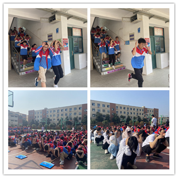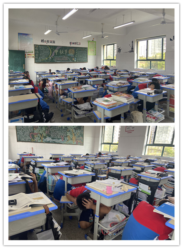 第一次警报响起,学校各楼梯口疏导负责人、班主任在第一时间各就各位,指挥学生就地避险,躲在桌子下或墙角处,十指紧扣,护住后脑。