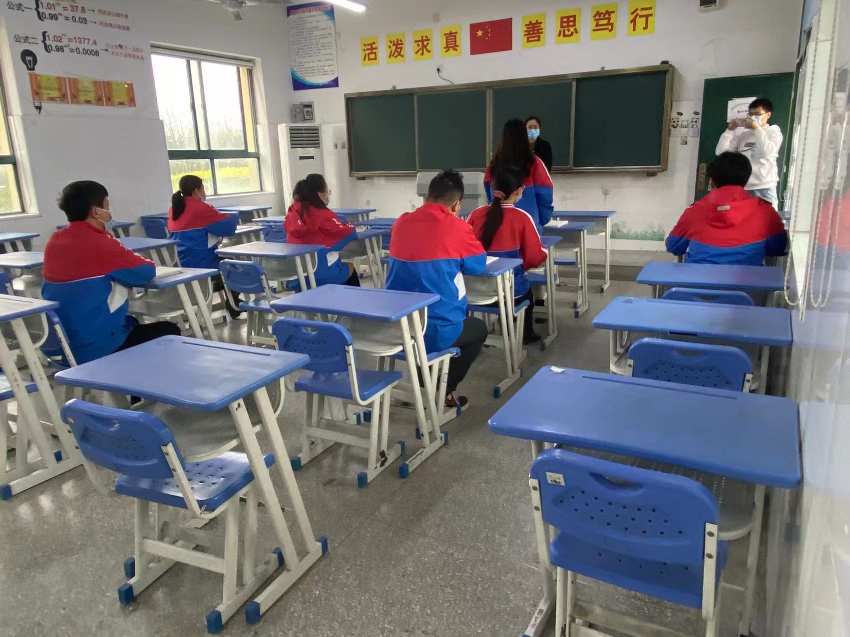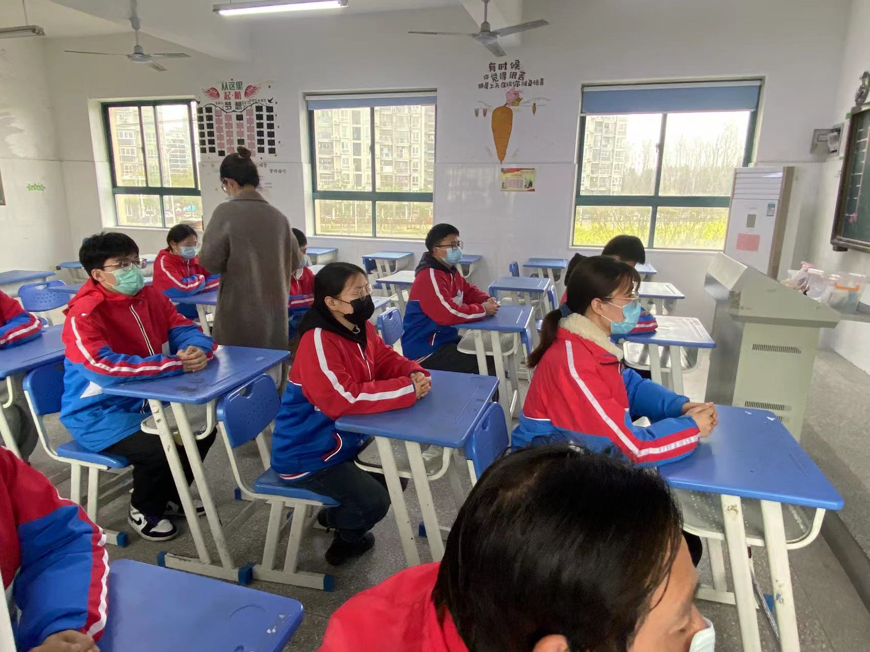 与此同时,班主任王老师示范更换 N95 口罩程序,并组织全班学生依次更换N95口罩,对学生桌面进行规范消杀。