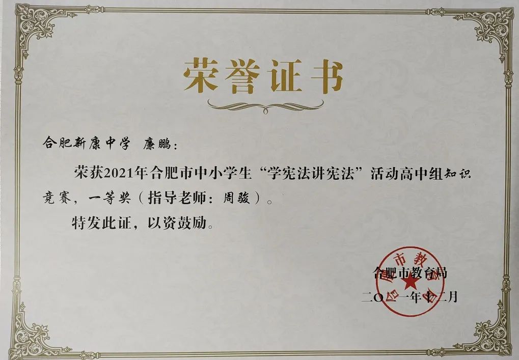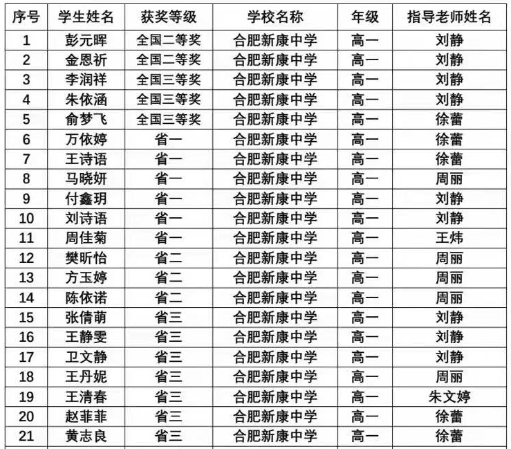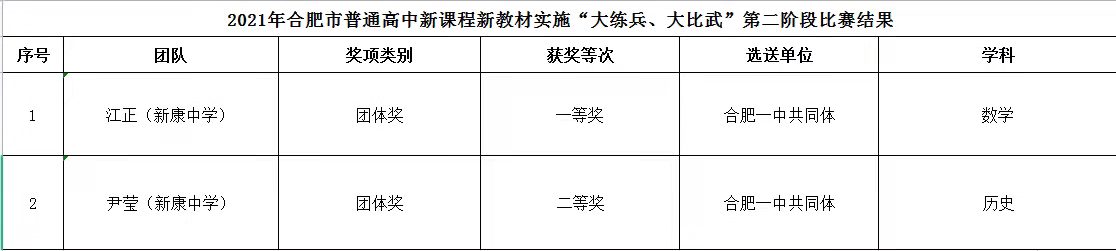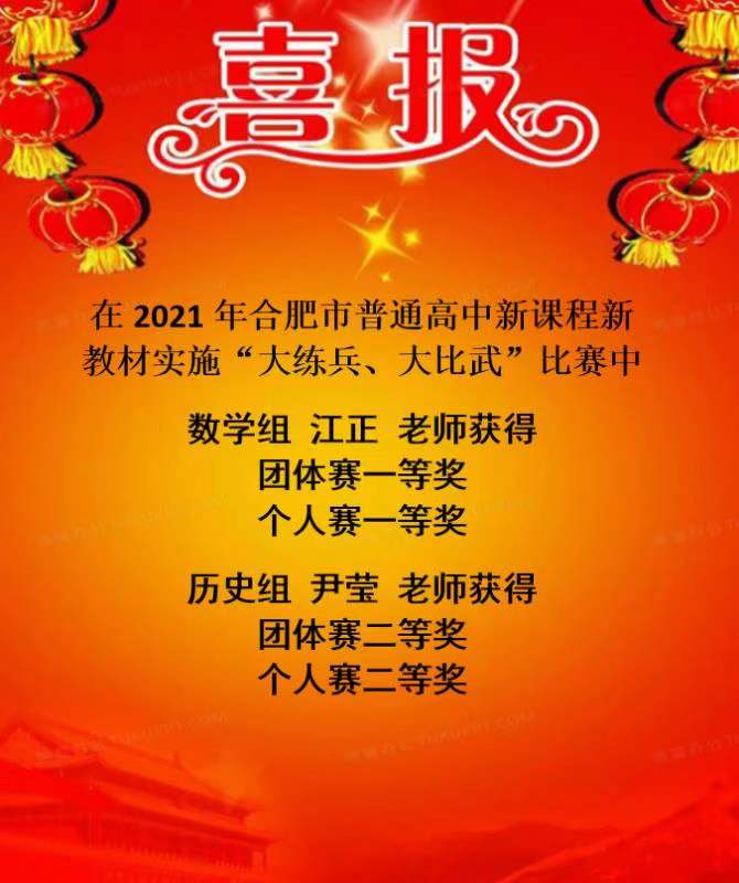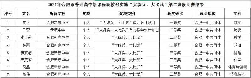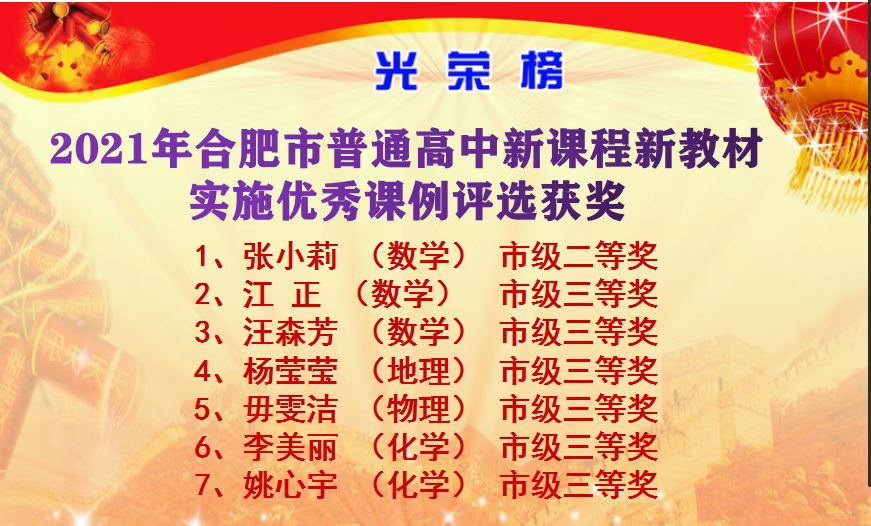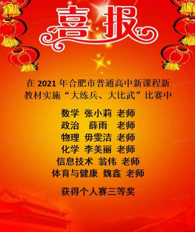 合肥市“双新”大比武、大练兵比赛中江正、尹莹、张小莉、毋文洁、李美丽、薛雨、翁伟、魏鑫获奖;合肥市高中优秀课例评比中张小莉、江正、汪森芳、杨莹莹、毋文洁、李美丽、姚心宇获奖;合肥市德育案例评比徐蕾获奖,会上对以上老师提出表彰,2022再创佳绩。