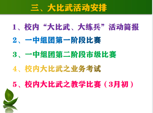 教师的使命,回归教学。教务张主任指出,要不忘初心,发展教学,优化教学,创新教学。教学比赛——“校内大比武”方案出台,业务考试——师生“合肥一模”同测,教学相长。