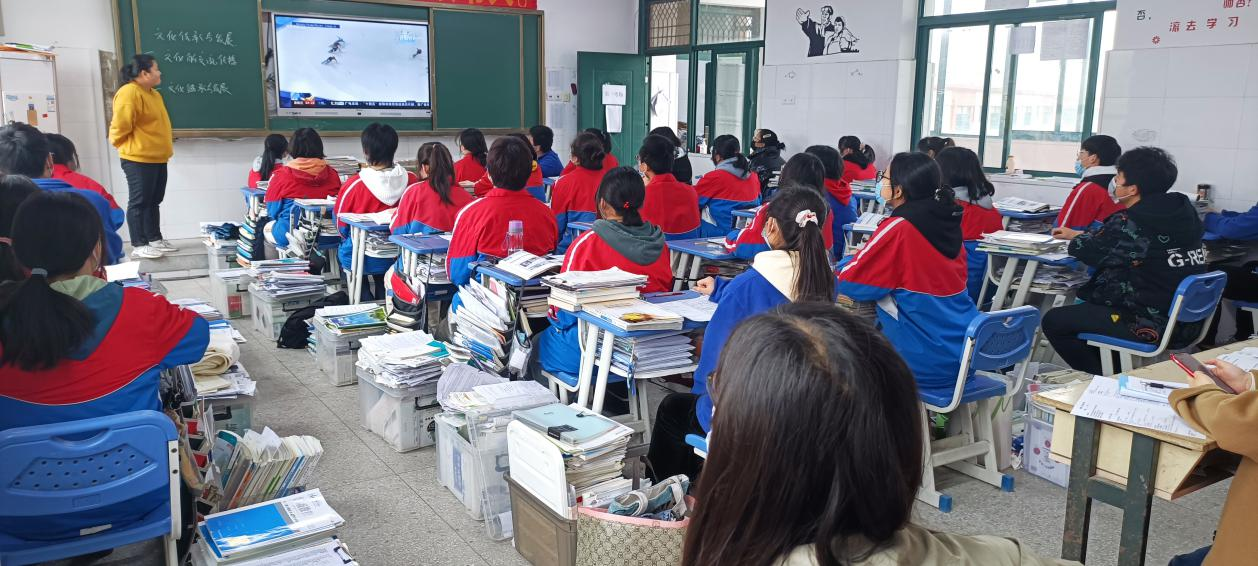 课前,薛雨老师紧跟时政热点,播放冬奥视频导入专题复习课,引导学生思考:什么是文化多样性的表现、地位以及对待文化多样性的态度,在新时代如何继承和发展文化?