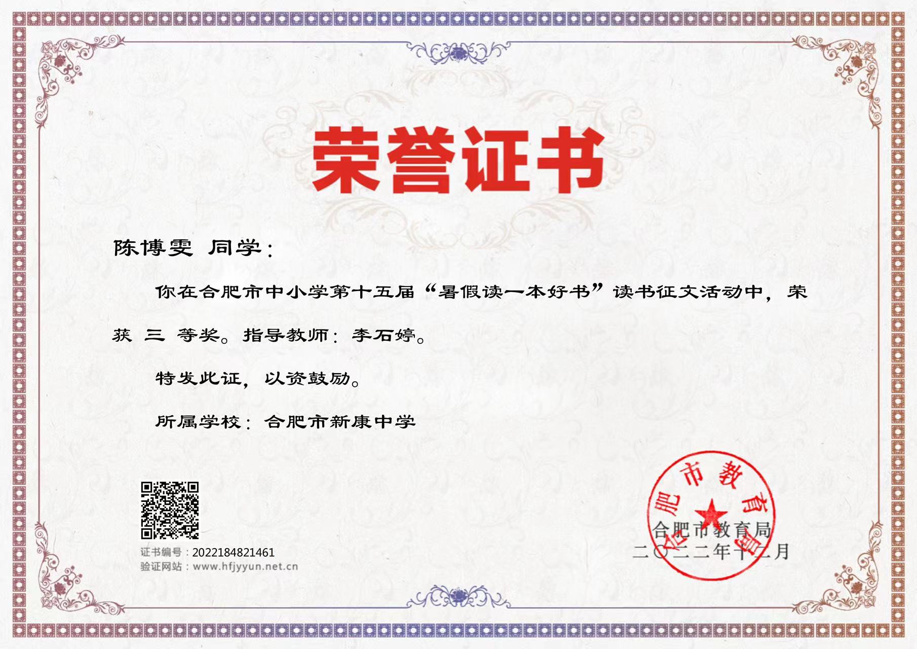 根据合肥市教育局发布的《关于开展合肥市第十五届“暑假读一本好书”读书征文活动的通知》,我校为营造书香校园文化氛围和全民阅读良好氛围,积极鼓励学生参加活动,促进学生全面发展。
