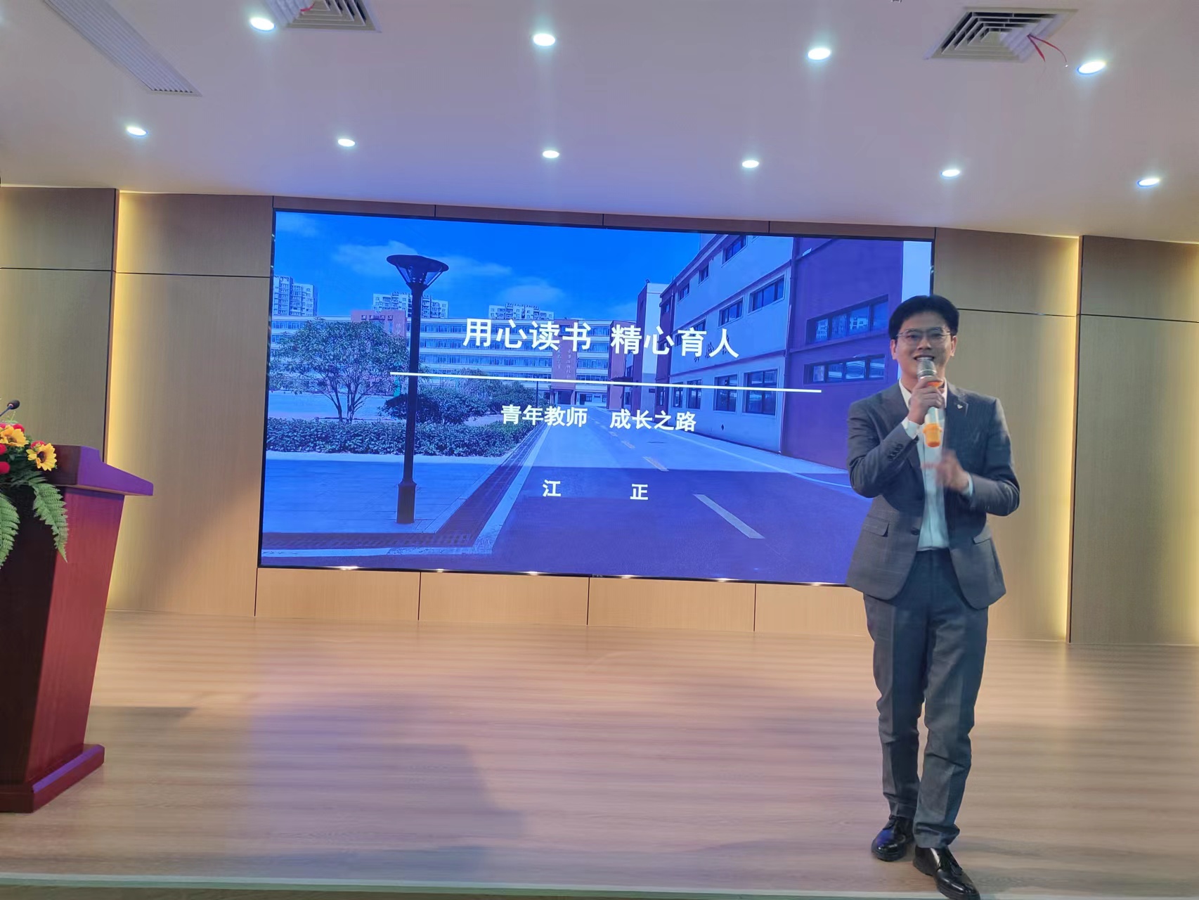 江正主任以《用心读书,精心育人》为主题分享了自己作为青年教师的成长之路。在分享中,他提到自己从刚踏上教师这条路上的迷茫到现在对这份职业的坚定之心。他分享着自己与学生一起成长的点点滴滴,他说“好的教育,一定是用爱真情地陪伴,也一定是润物无声”。