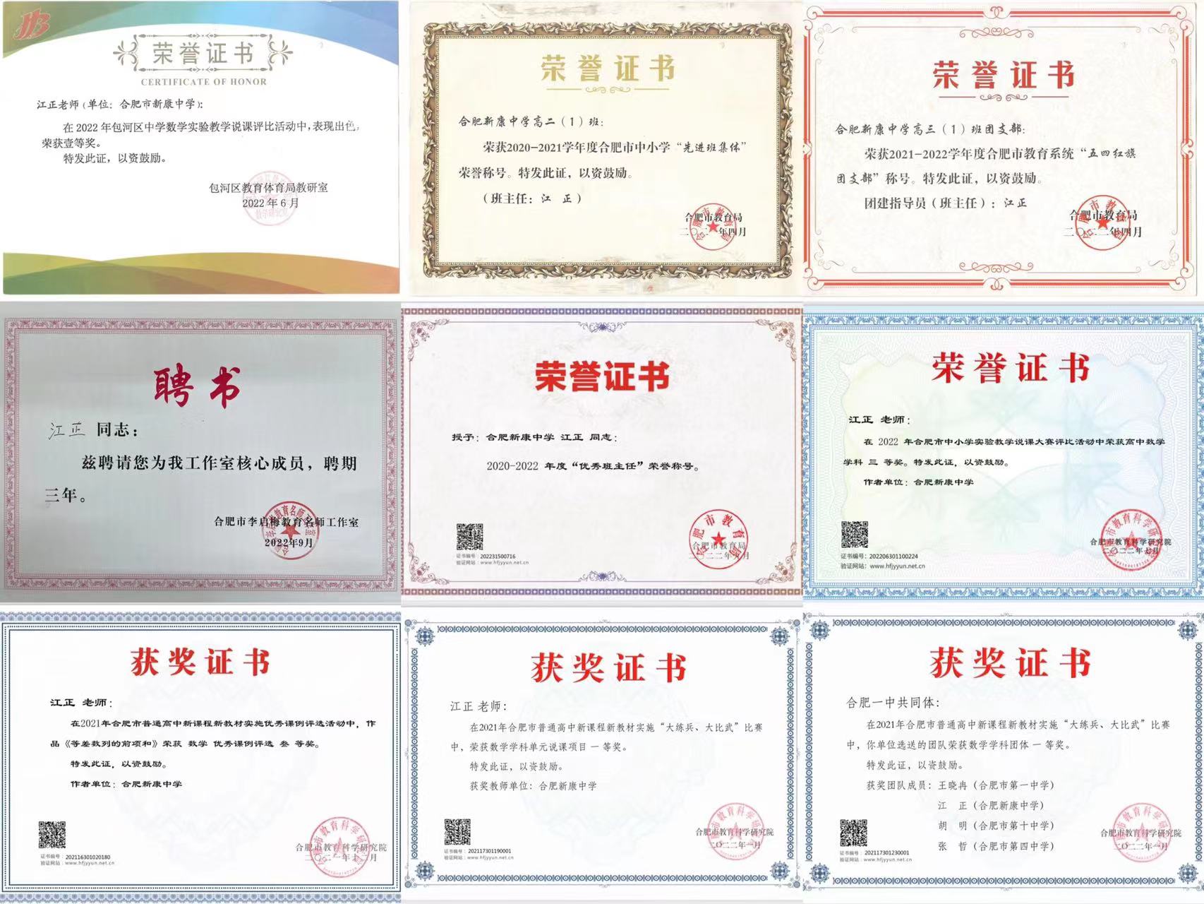 在江正主任的悉心教导下,他的班级学生取得了优异的成绩,同时他个人也在教育事业上取得了优异的成绩,荣获了合肥市”大比武、大练兵“数学学科一等奖;中小学实验类说课比赛区一等奖、市三等奖;合肥市优秀班主任、合肥市数学名师工作室成员;班级也获得合肥市先进班集体、合肥市五四红旗团支部。