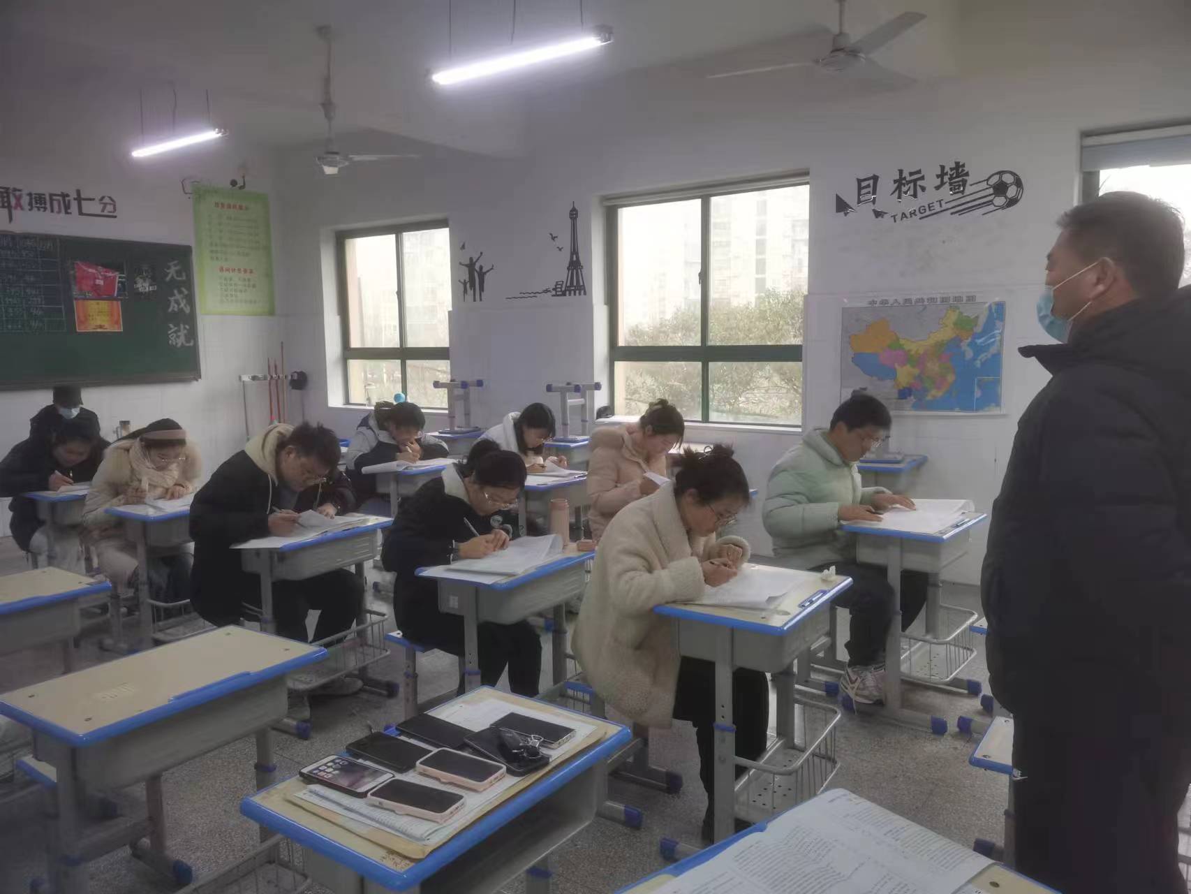为提高教师的专业知识,促进教师的专业成长,优化教师的课堂教学。我校特举行师生同测,专备教师考场,与学生同时间同试卷参加考试,或许我们不能人人都成为优胜者,但我们应该做一名追求进步、超越自我的勇敢者。