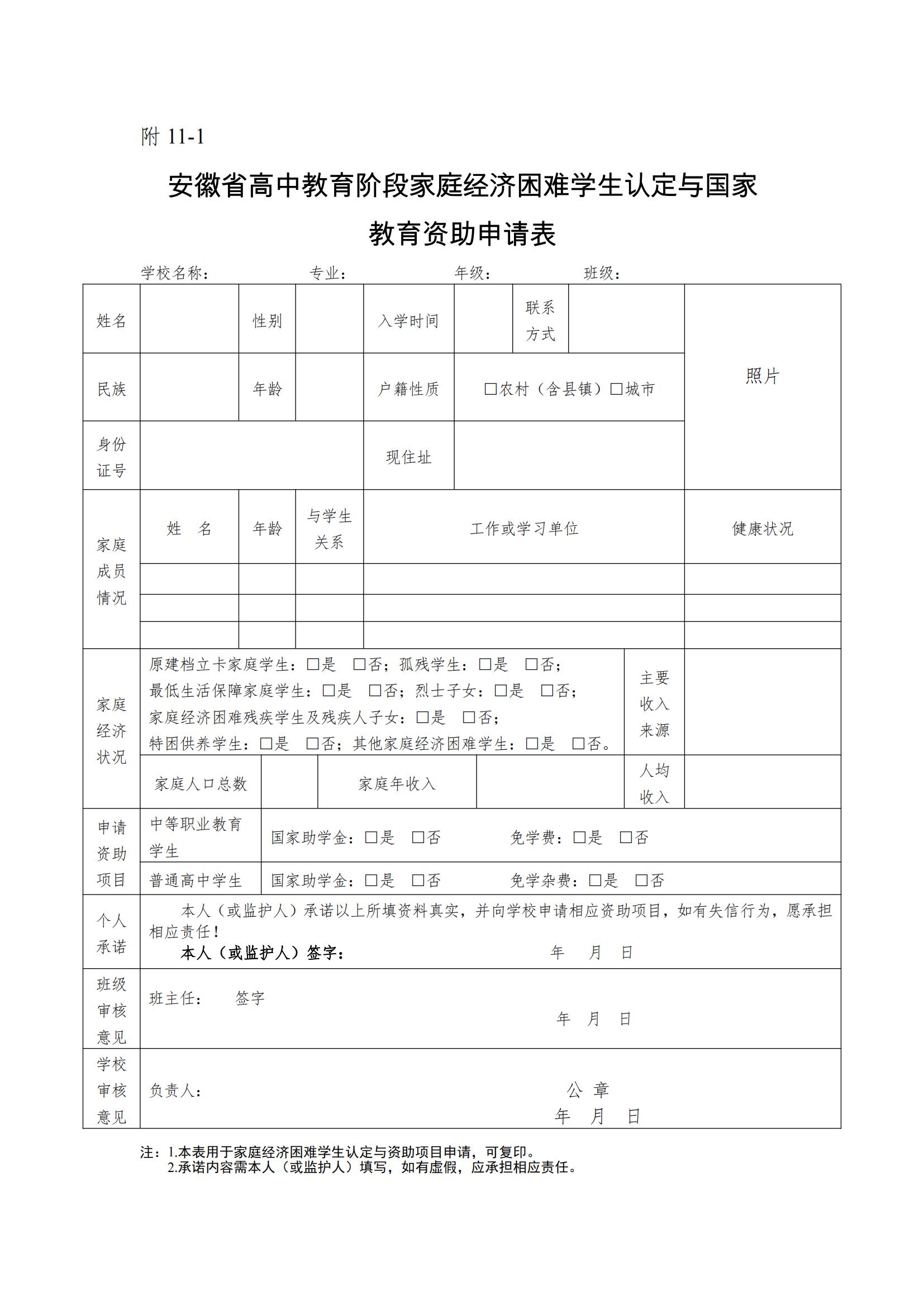 符合条件的家长于9月17日前自行打印《安徽省高中教育阶段家庭经济困难学生认定与国家教育资助申请表》,填好申请表,并将相关证明材料复印件(学生本人身份证、户口簿户主页及本人页),返校后交给班主任审核。