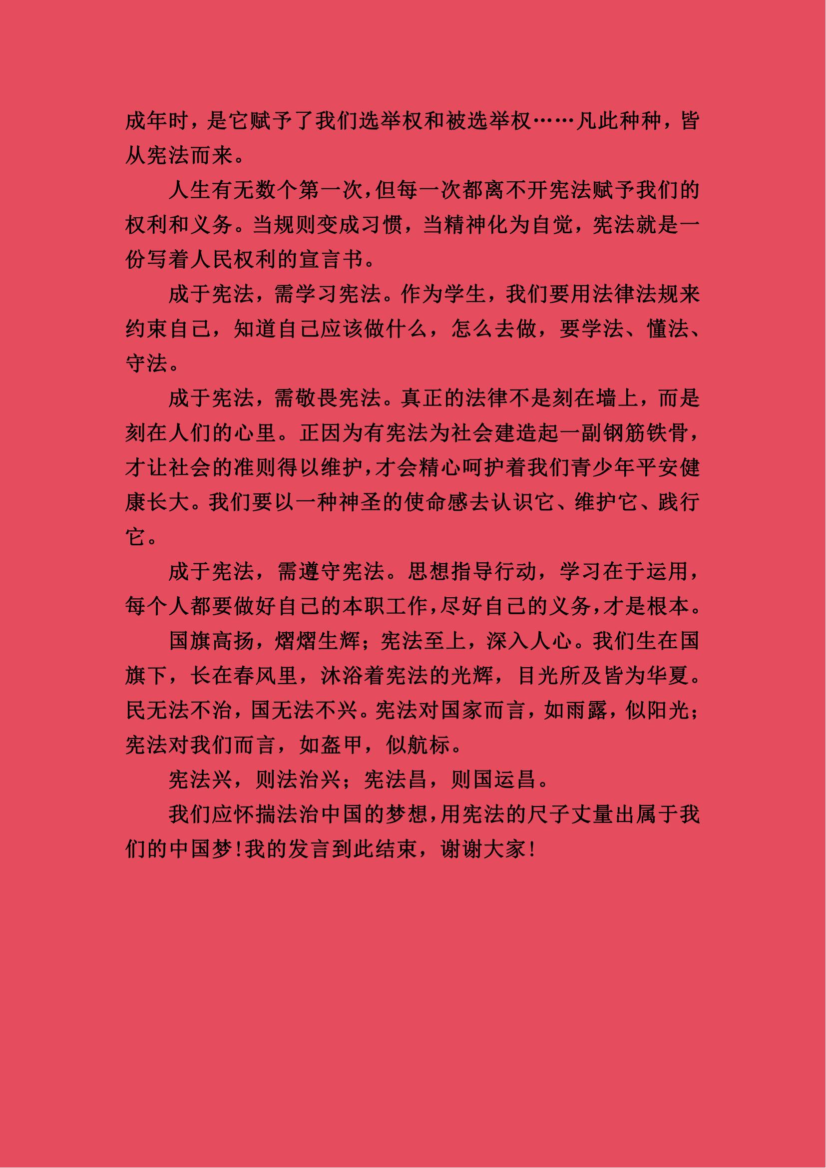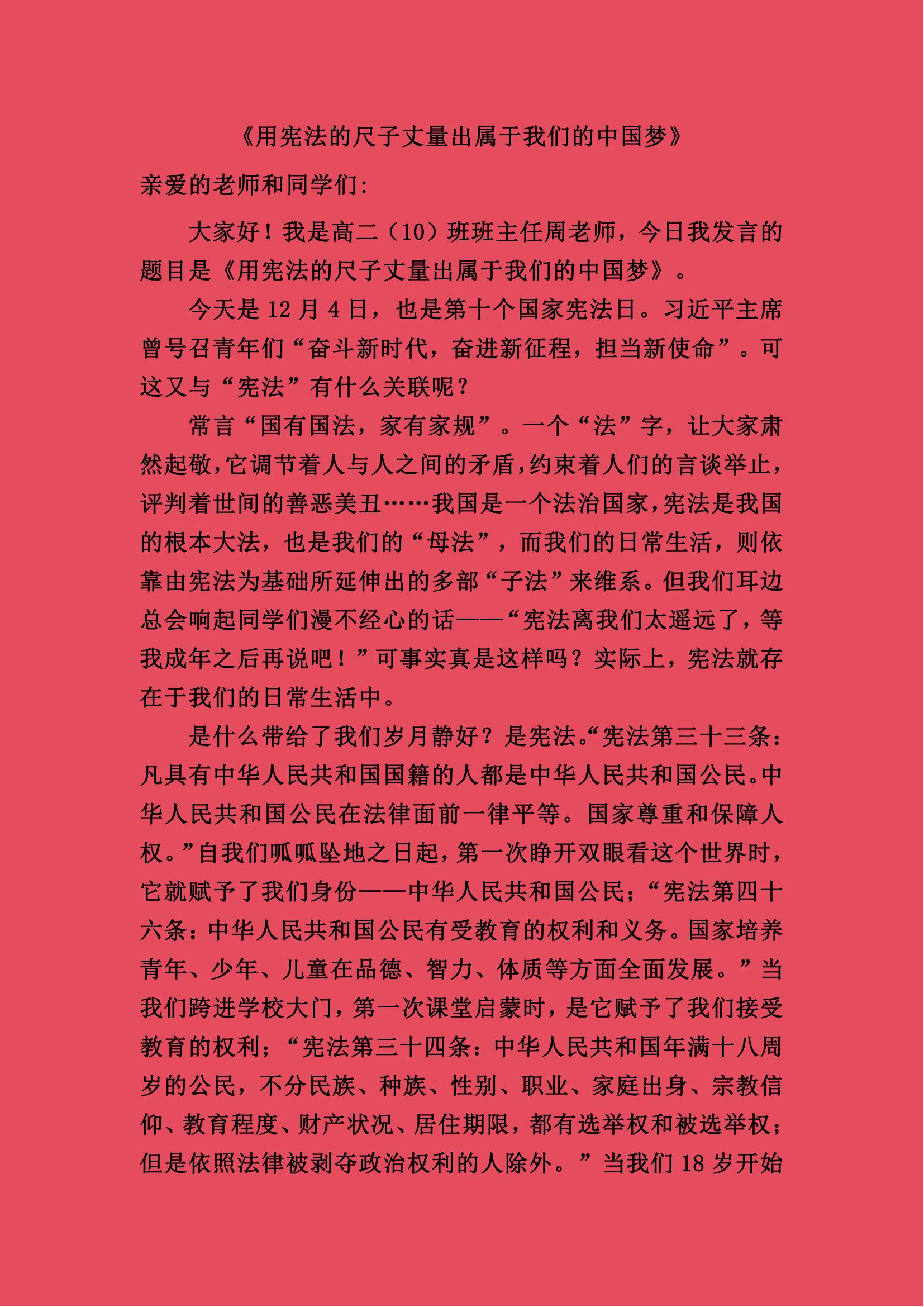 高二10班班主任周骏老师做国旗下的讲话,他强调了宪法在我们生活中的重要性,号召全体师生学法、知法、守法、护法,传承和弘扬宪法精神,为社会主义法治文化的建设贡献力量。