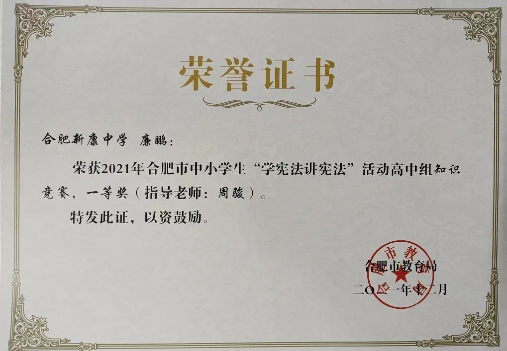 我校历来重视宪法宣传工作,积极参与和组织各项活动,强化学生的法制教育,增强学生的法治意识。先后组织学生参加“学宪法、讲宪法”活动,廉鹏同学荣获知识竞赛一等奖、王煜鑫同学荣获知识竞赛三等奖。