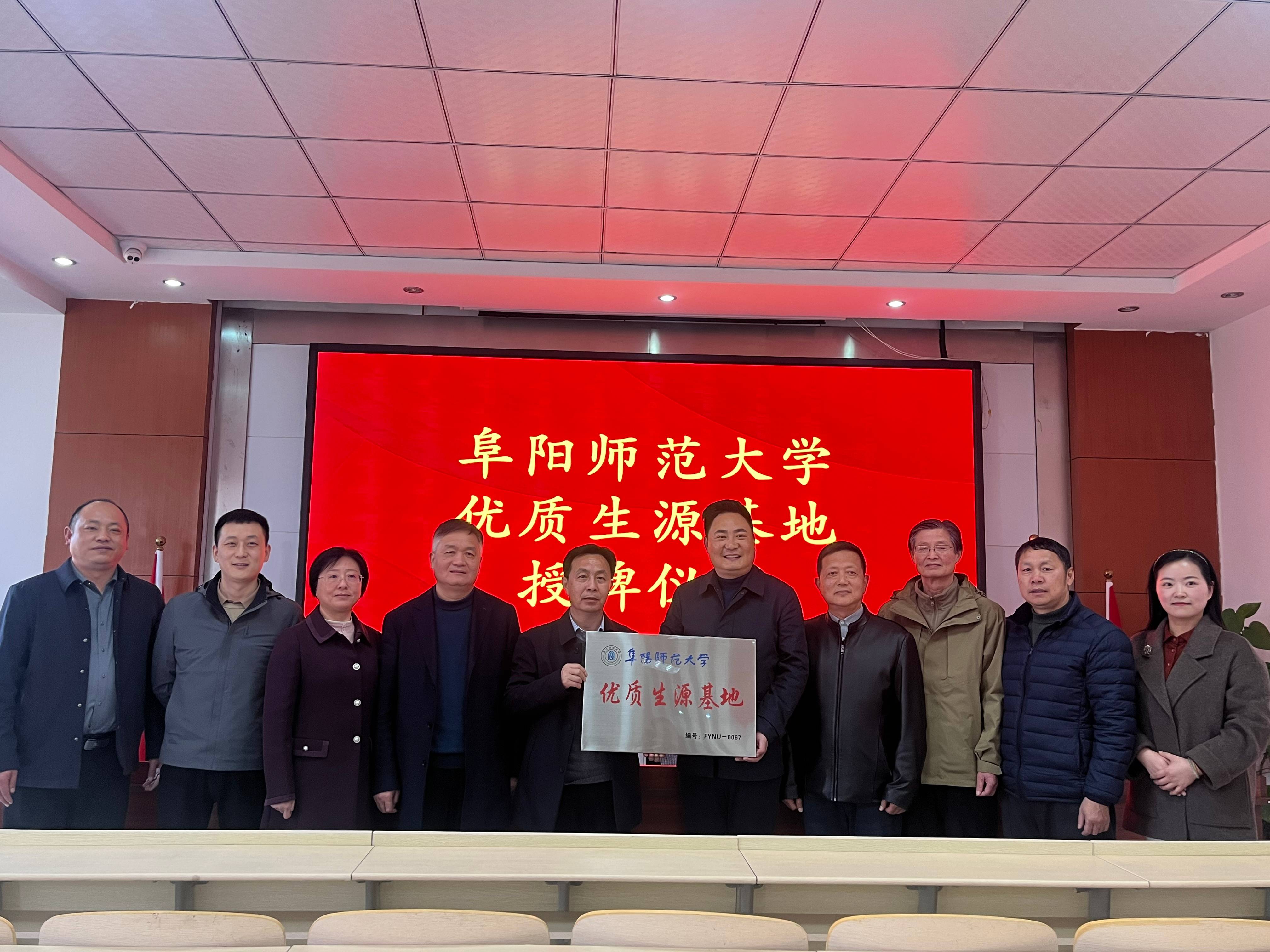 阜阳师范大学党委委员、招生就业处处长方强,阜阳师范大学党委委员、人事处处长卢少求,阜阳师范大学教育学院党委书记李静,阜阳师范大学招生就业处招生科科长潘沈洁一行莅临合肥新康中学,代表阜阳师范大学考察并授予合肥新康中学“优质生源基地”和“就业创业实践基地”称号。合肥新康中学党支部书记、总校长王俊,教育局派驻合肥新康中学教育督导稂乐民等参与接待。