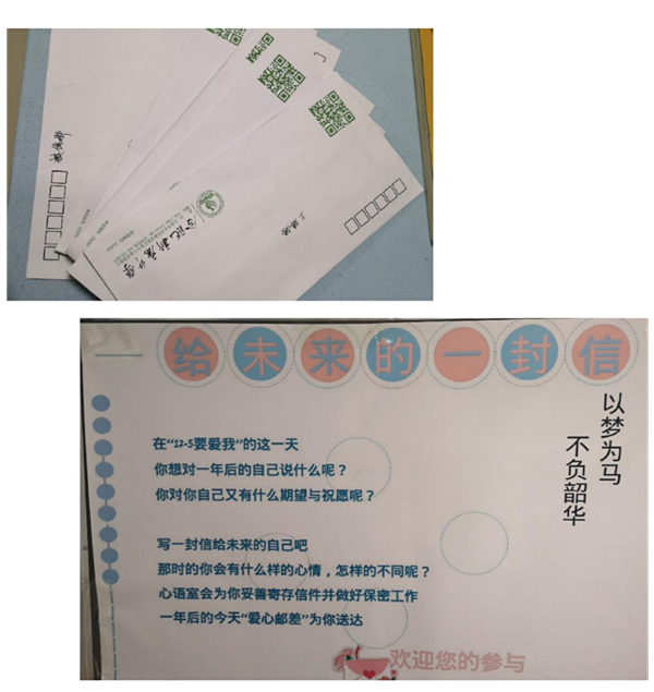 12月5日当天,心语室在教学楼举行“写给未来自己的一封信”活动,参与的同学们写下给一年后自己的寄语之后密封上交,心语室代为寄存一年。一年后的当天,也就是2020年12月5日,心语室将会把收到的信件再次递到参与活动的同学手中。此项活动形式新颖,学生参与度极高,纷纷提起笔来写下自己对一年后生活的展望和祝福。