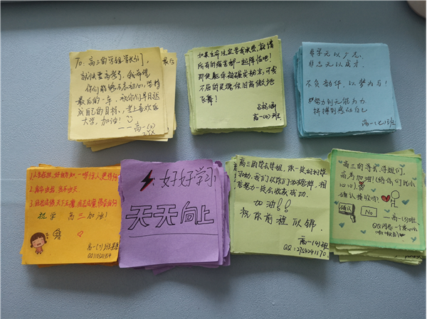 讲座开始之前,为了调动高三学生的积极性和现场气氛,柴老师特意征集了来自高一学生对高三学长学姐的“爱的鼓励”,并下发到每一个高三学子手中,高三学生对此深受鼓励。