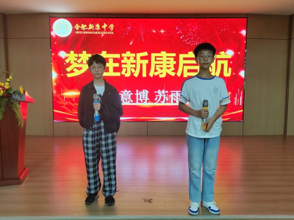 首先是七(4)班王意博、苏雨萱同学的诗朗诵《梦在新康启航》,将千言万语凝成祝福,赠与八、九年级的学长学姐和朝夕相处的老师们。