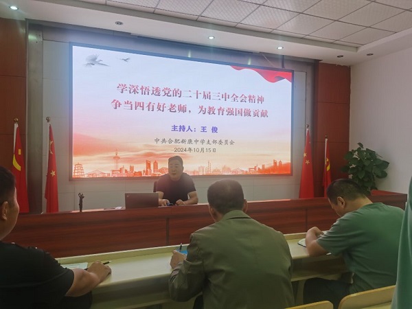 10月15日,合肥新康中学党支部王俊书记主持开展“学习党的二十届三中全会精神,努力实现新康教育高质量发展”书记上党课活动,校党支部专职副书记陈晓永主讲。