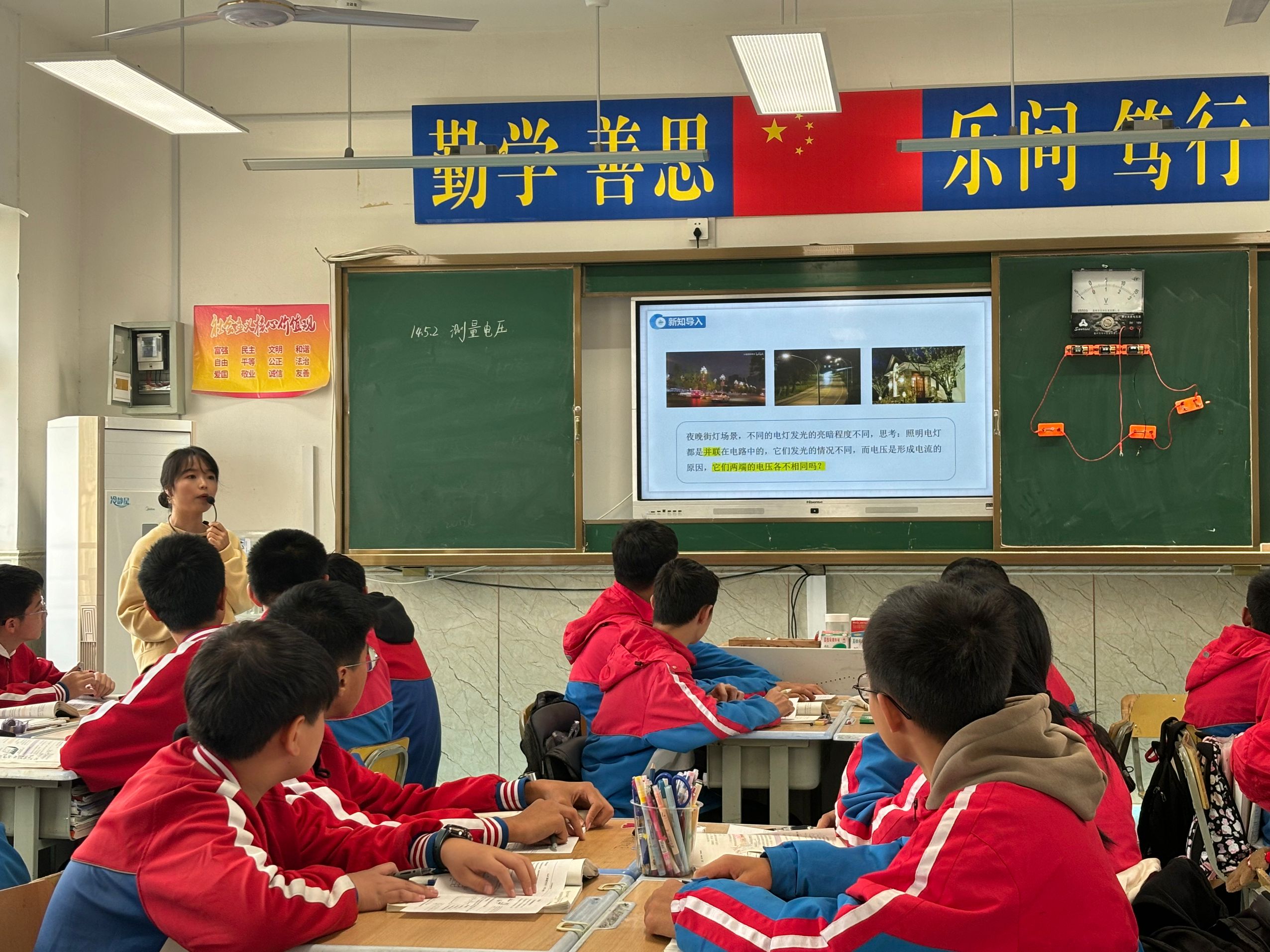2024年1025上午午第2节课,骆家敏老师在九4班进行了一节课题为《14.5测量电压》的新课公开视导课。在电学中,电压规律的重要程度不言而喻。