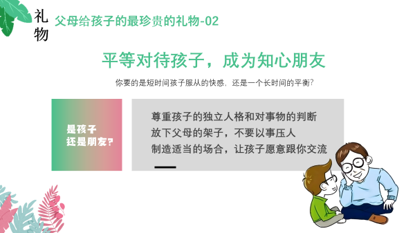 第二个礼物是:父母应学会平等对待孩子,努力成为他们的知心朋友,父母要尊重孩子的独立人格和对事物的判断,要放下父母的架子,不要以事压人,营造轻松愉悦的氛围,让孩子愿意跟你交流。父母要学会倾听孩子的倾诉,安静的倾听比争辩更有利于亲子关系,家是讲“爱“的地方,不是讲“理”的地方。