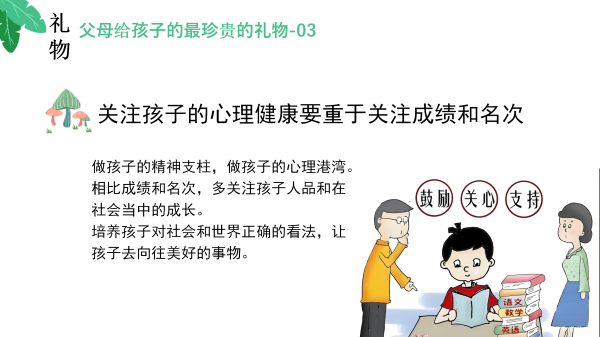 第三个礼物是:关注孩子的心理健康要远远重要于关注成绩和名次。在竞争激烈的当下,许多家长往往过于看重孩子的学业成绩,却忽略了他们内心的情感世界。一个心理强大、健康的孩子,才能更好地面对生活中的种种挑战,拥有真正的幸福与成功。父母要做孩子的精神支柱,做孩子的心理港湾。相比成绩和名次,应更多的关注孩子人品和在社会当中的成长。培养孩子正确的人生观、价值观,让孩子去向往美好的事物。