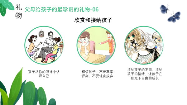 第六个礼物是:父母要学会欣赏和接纳孩子。每个孩子都是独一无二的个体,都有自己的闪光点与不足。家长要用欣赏的眼光去发现孩子的优点,接纳他们的不完美,给予鼓励与支持,帮助孩子建立自信。