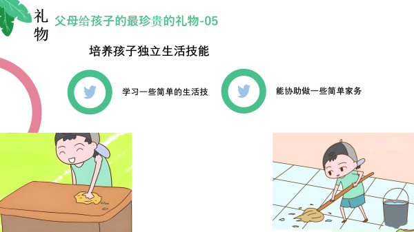 第四个礼物是:培养孩子独立生活技能。让孩子学会自理生活,从简单的家务劳动到自我管理时间与事务,这些技能将伴随他们一生,成为其立足社会的重要基础。