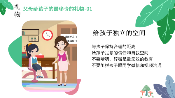 本场讲座由我校心理咨询室盛爽老师主讲,讲座中提到的首要礼物就是给孩子独立的空间。家庭和睦是给孩子最好的心理营养,呼吁家长朋友不要唠叨,碎嘴是最无效的教育。要给孩子独立的空间就意味着父母要尊重孩子的隐私与个人世界,给孩子足够的信任和自我空间,允许他们有自主思考与探索的机会,而不是将自己的意愿强加于孩子。