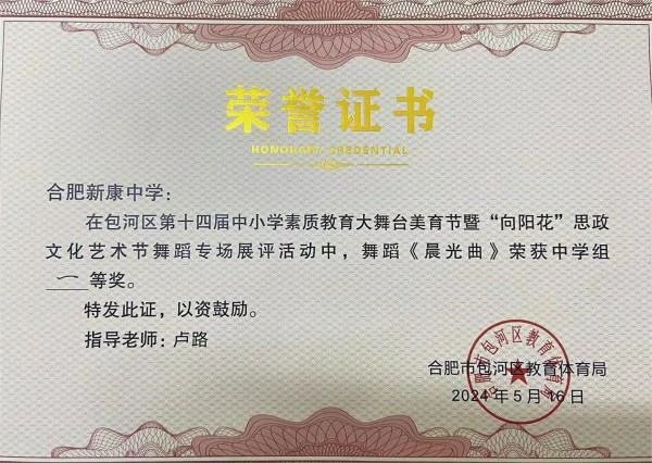 舞蹈社团,是青春律动的展现。在这里,学生们跟随着音乐的节奏,轻盈起舞,无论是古典舞的优雅,还是现代舞的活力,都在他们的舞姿中得到了完美的诠释。每一次旋转、每一个跳跃,都是对美的追求和对艺术的热爱。在上学期的包河区第十四届中小学素质教育大舞台美育节舞蹈专场中,合肥新康中学高中部代表队凭借舞蹈节目《晨光曲》荣获一等奖,展现了学校舞蹈教育的丰硕成果。
