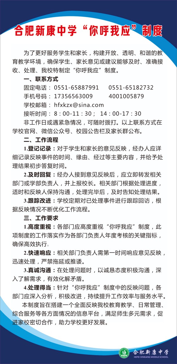 4.积极建言献策:我校上学期出台了“你呼我应”制度,欢迎广大家长通过已公示的联系方式沟通交流,以便于我们进一步改进工作。