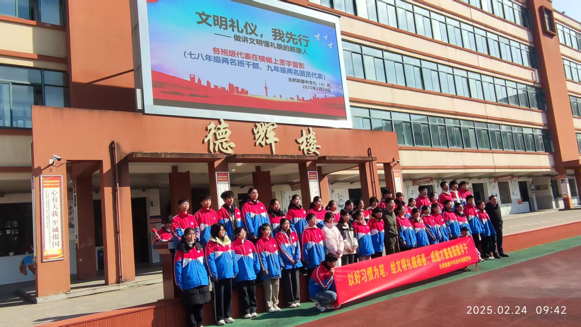●文明礼仪,我先行——主题升旗   2 月 24 日,合肥新康中学初中部举行“文明礼仪,我先行”主题升旗仪式。仪式上,主持人强调文明礼仪重要性,倡导同学们从点滴践行。随后,同学们有序在“文明礼仪,我先行”横幅上庄重签名,以表决心。此次活动增强了大家的文明意识,将激励同学们以实际行动让文明礼仪之花绽放校园。