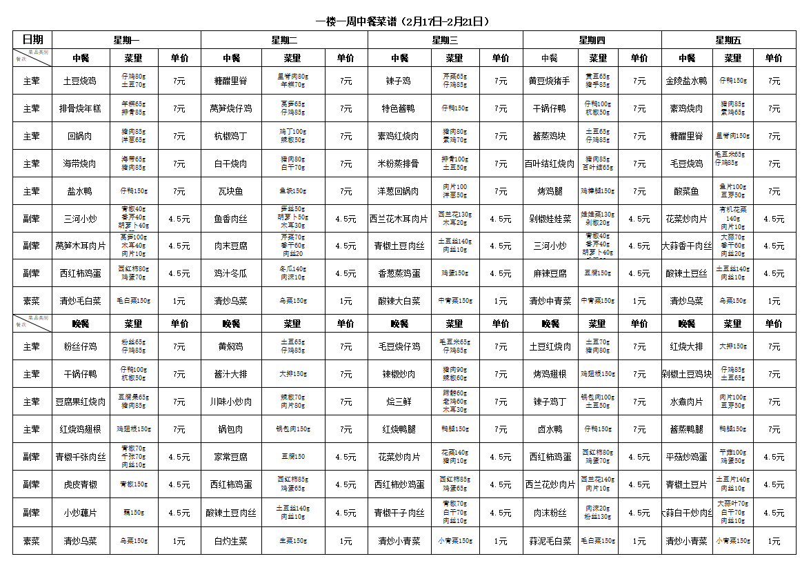 合肥新康中学食堂一周菜谱(3月3日-3月7日)