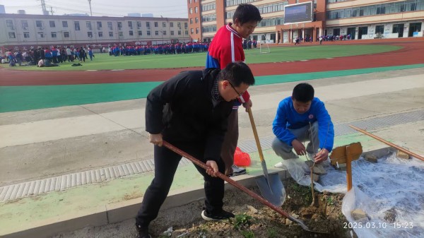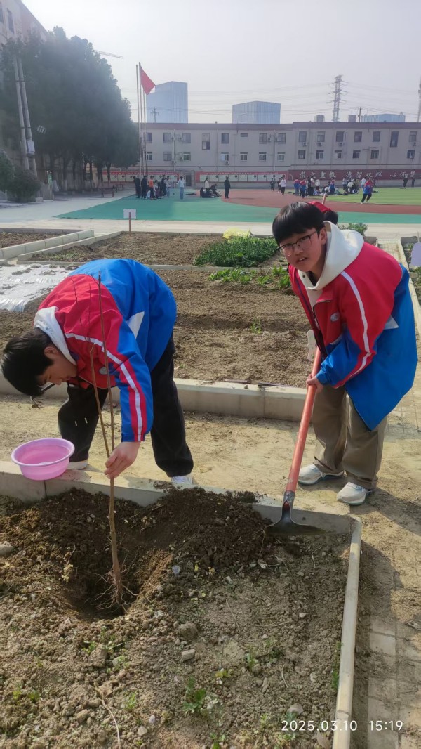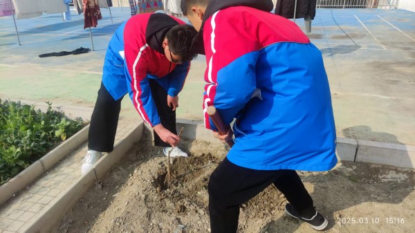 在老师的带领下,同学们以小组为单位,分工协作。有的挥锹铲土,有的扶苗填坑,有的提水浇灌,每一个步骤都认真细致,现场一片热火朝天的劳动景象。本次活动种植的树木种类丰富,有寓意桃李满天下的桃树、李树,有代表幸福吉祥的杏树,以及寓意蒸蒸日上的石榴树,共计十几棵。这些树木不仅为校园增添了自然之美,更承载着同学们对校园的美好期许。