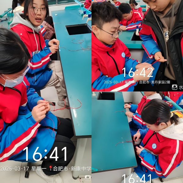 ◆手工社团:本节课学生学习编织红绳手链。将两根长短不同的红绳并排放置,先将长绳压在短绳上方,长绳从短绳下方穿过,形成一个圈,然后拉紧长绳,接着再反向操作一次。重复交替进行,如此循环,就能编织出平结。在编织过程中,注意保持绳子的松紧度一致,编织出整齐美观的红绳手链。