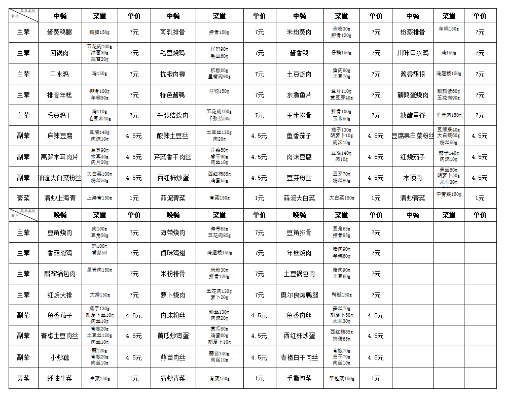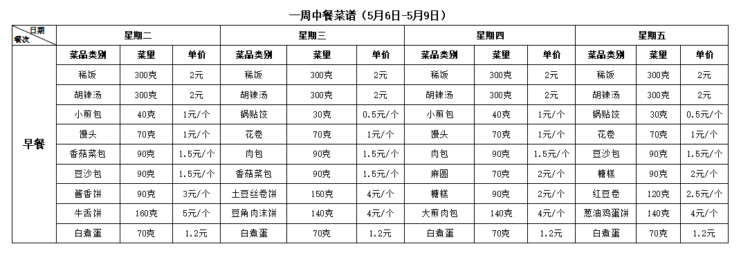 合肥新康中学食堂一周菜谱(5月12日-5月16日)