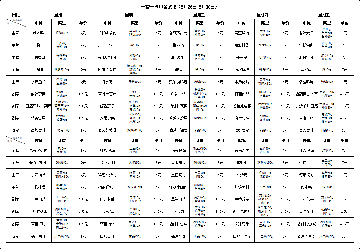 合肥新康中学食堂一周菜谱(5月19日-5月23日)