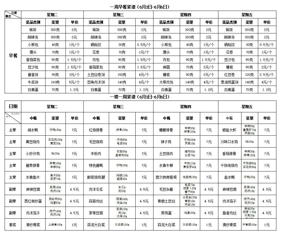 合肥新康中学食堂一周菜谱(6月9日-6月13日)