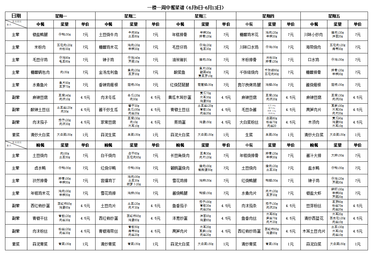 合肥新康中学食堂一周菜谱(6月16日-6月20日)