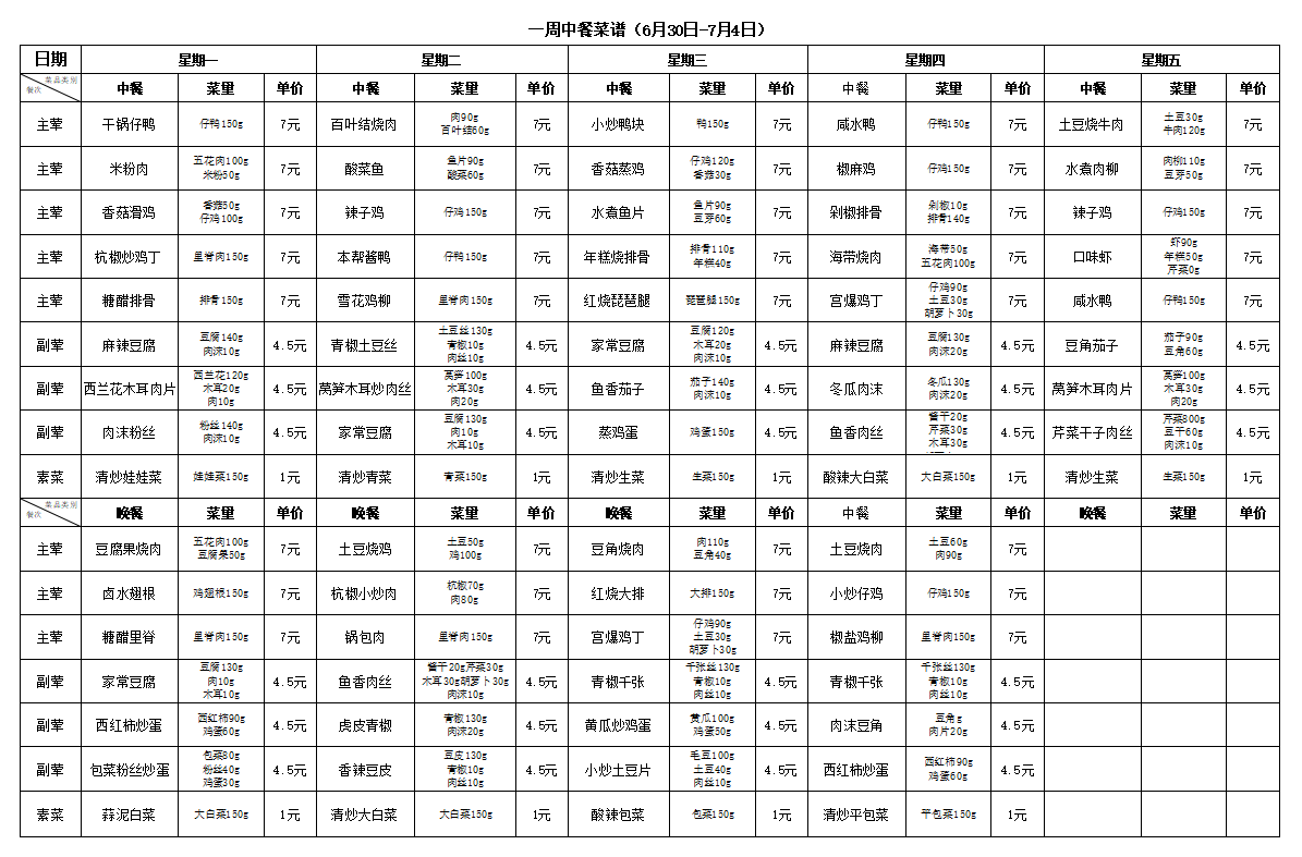 合肥新康中学食堂一周菜谱(6月23日-6月27日)