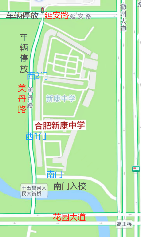各位同学及家长从南门入校,请各位家长将车辆有序停放在延安路及美丹路,保持学校门口畅通。