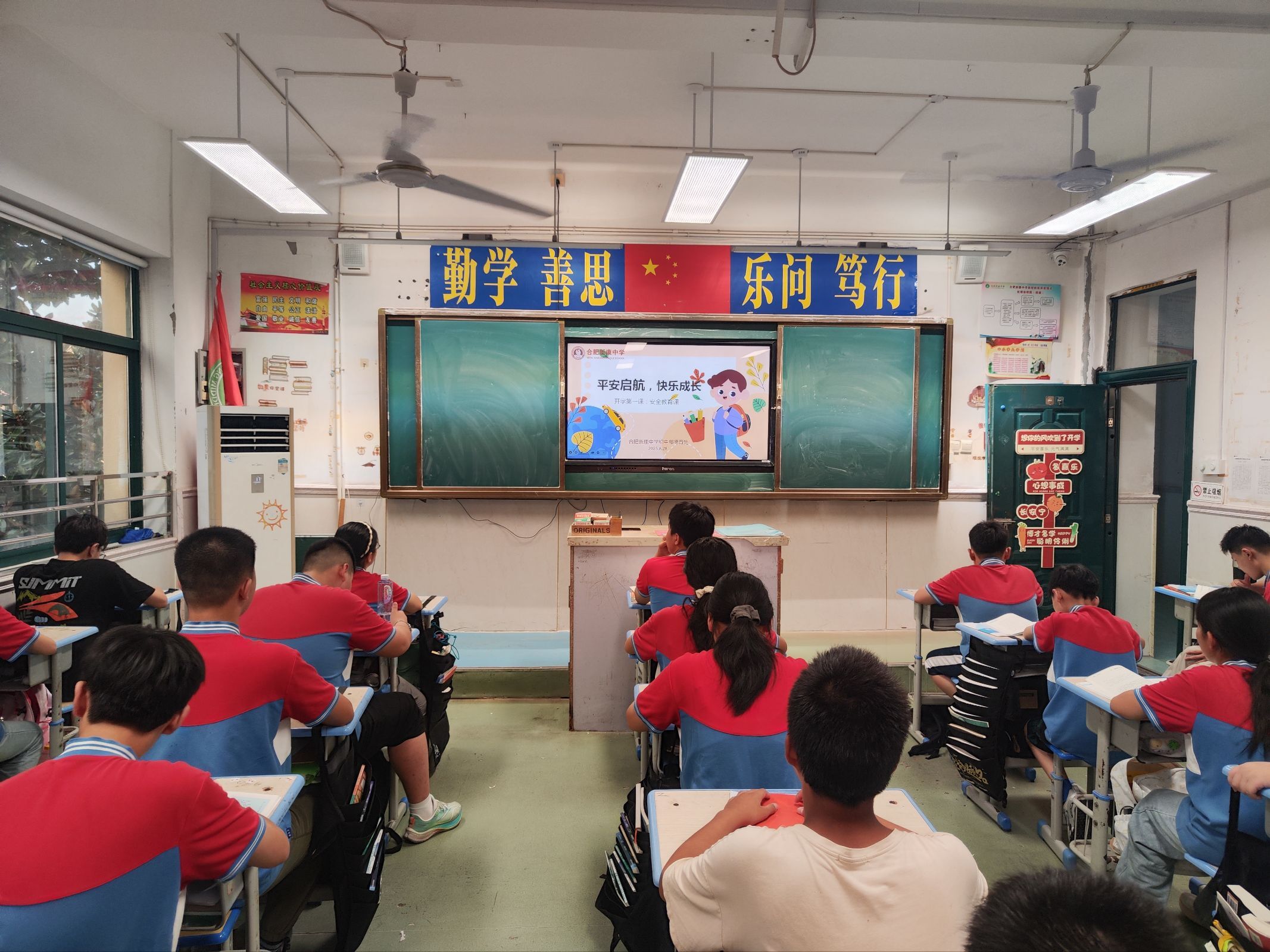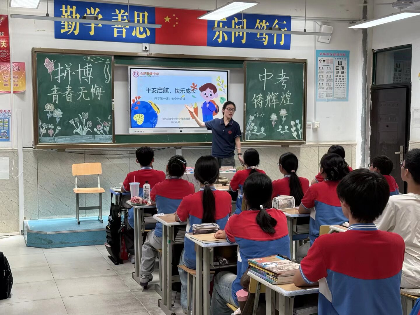 为进一步增强学生安全意识,营造“人人讲安全、事事为安全”的校园氛围,8月31日下午,合肥新康中学初中部组织全体学生开展“平安启航,快乐成长”开学第一课主题班会。活动围绕校园、交通、防溺水、食品、消防、网络、防欺凌、心理等八大安全板块展开,以案例警示、情景演练、互动宣誓等形式,为新学期系紧“第一粒安全纽扣”。